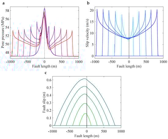 Figure 4a,b include the undrained pressure and slip velocity fronts at several time steps during a rupture for the 2006-Basel injection protocol included in Figure 2a. We observe that for the Basel reservoir conditions, the model predicts an almost symmetrical propagation of the rupture. Both the undrained pressure and the slip velocity fronts propagate at similar speeds in both directions of the fault. Figure 4c shows the slip of the fault at the same time steps.