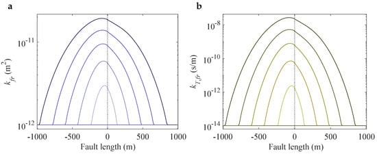 We solve Equations (8)–(12) for fluid flow and Equations (13) and (14) for heat transport along the fault. We consider that the fault permeability changes with fault slip so that both seismic and co-seismic slip produce an increase in permeability, both longitudinally and across the fault [95]. This allows us to reproduce the permeability stimulation in the fractures with a mechanism similar to hydro-shearing. We review the literature to quantify the increase in permeability due to hydro-shearing. Experiments performed on samples with a single fracture indicate that the permeability of a hydraulically stimulated contact increases by an order of magnitude due to slip [96,97], while hydraulic fracture experiments indicate that this rise can reach three orders of magnitude [98]. Therefore, we assume that permeability increases one or two orders of magnitude with fault slip.