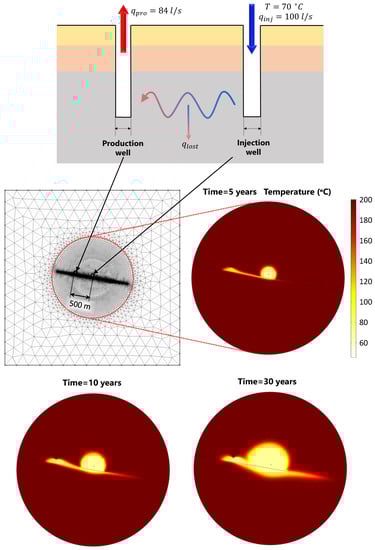 Figure 6 depicts the temperature field at 5, 10, and 30 years. We observe that heat is mainly transported by advection in the vicinity of the fault once the temperature drop around the well reaches it. Subsequently, the cooling reaches the extraction well and extends to larger areas around the injection well.