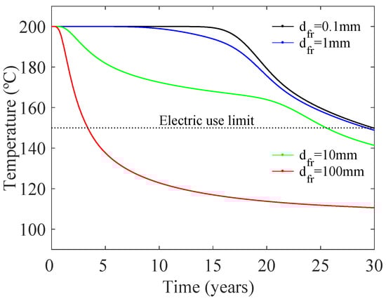 These results show that the fault permeability directly influences the long-term thermal decline: as the permeability increases, the thermal decline is faster [64,65], as represented in Figure 7. Recent research works relate heat production with the fracture network topology and they reach similar conclusions to our work [66,67]. Our results support the conception that geothermal reservoirs may be economically feasible for two or three decades. Although reservoirs would naturally recover heat by diffusion, several centuries are required since heat transport by diffusion is much slower than by advection.