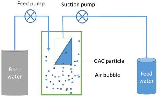 The performance of GAC on the removal of micro-pollutants was studied using a MF-GAC hybrid system (Figure 2). The experimental procedure is stated in the previous studies [17,31]. An MF membrane (flat sheet) was submerged in the reactor tank containing 10 L of micro-filtered BTSE. Peristaltic pumps were used control the flow of feed water in and out of the tank. The TMP of the membrane filtration was measured using a pressure gauge. Initially, 20 g of GAC was added to the reactor tank to maintain the GAC dose of 2 g/L. The reactor tank was fed with continuous air flow at 1.5 m3/m2 membrane area h (pre-determined), which keeps the GAC particles in suspension. The air flow also produces shear stress across the membrane surface, and this leads to a reduction of fouling of the membrane. The loss of volatile organic compounds (VOCs) due to aeration was neglected as the wastewater used in this study was previously biologically treated and stabilized. The primary purpose of the MF (flat sheet membrane) was to remove particulate GAC [32].
