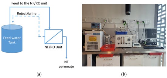NF/RO membrane filtration unit: (a) schematic diagram; (b) laboratory set-up.
