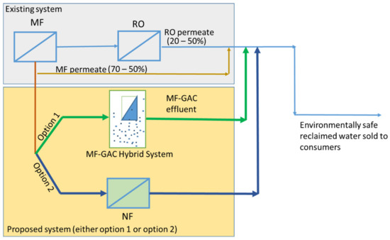 Development of sustainable hybrid systems for the removal of all micro-pollutants of different chemical and physical properties is the key for the water reclamation. In this study, the performance of MF-GAC hybrid system and NF were equally good in the removal of micro-pollutants. Therefore, a portion of the MF permeate (presently in blends of between 70–50%) could be sent to either the MF-GAC hybrid system or NF membrane (NTR 729HF) to further reduce the micro-pollutants in the MF permeate before blending with the RO permeate (Figure 4).