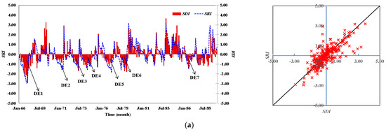 Comparison between historical SDI and SRI series of the selected four sub-basins are shown in Figure 4. It can be found that the SRI series calculated using monthly runoff simulated by the modified TPMWB model capture several severe drought episodes, which is in accordance with the fluctuation of SDI, especially in dry months whose values are less than zero. For example, severe droughts (DEs) during 1966–1967, 1971–1972, 1973–1974, 1974–1975, 1976–1977, 1978–1979, and 1986–1987 at Sheqi can be recognized from both the SRI and the SDI series, together with identification of drought events during 1966–1967, 1980–1981, and 1986–1987 at Taikou, during 1965–1967, 1978–1979, and 1986–1987 at Wanyugou, during 1965–1967, 1972–1973, 1977–1978, 1979–1980, and 1986–1987 at Youshuijie.