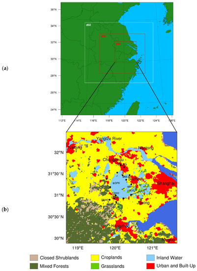 The Weather Research and Forecasting model [51] is a non-static compressible mesoscale weather forecasting model. The model has a reasonable dynamic frame structure and a variety of parameterization schemes suitable for different weather conditions. The horizontal resolution can support the variation range from a few meters to a few thousand kilometers. Chen and Zhang [52] showed that in the Lake Taihu Basin, the unified Noah land surface model [53,54], with a single-layer urban canopy model [55] and MYJ [56] boundary layer schemes, provided a good simulation performance and, therefore, these schemes are used in this study. The rapid radiative transfer model (RRTM) was selected for both long and short-wave radiation schemes in the model [57]. The WRF double-moment six-class (WDM6) microphysics scheme [58] and Kain–Fritsch cumulus scheme [59] were used only for d01 and d02.