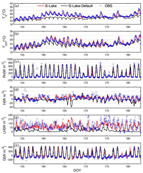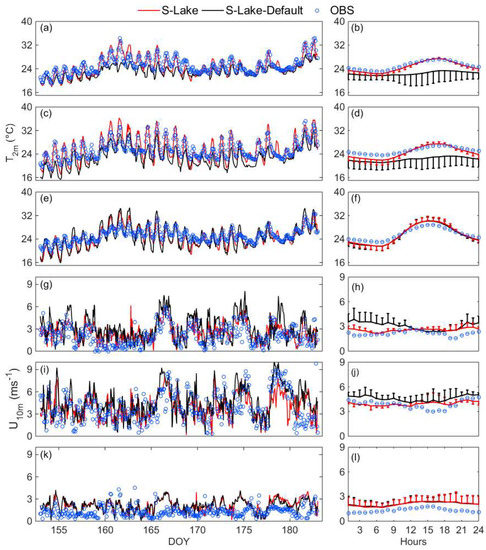 Generally, S-Lake provides a markedly improved prediction in low background wind and clear sky conditions. Under these conditions, the surface has a strong forcing influence on the lower atmospheric boundary layer. From 7 June to 12 June (DOY 159–164), there is little cloud cover with strong radiation (Figure 2c), and the wind speed is low (Figure 3g). In this period, the 2 m air temperature at station K5002 increases progressively over time (Figure 3a), reaching 36.3 °C, the highest of the month, at 14:00 on 9 June (DOY 161). S-Lake reproduced this maximum temperature of 36.0 °C (Figure 3a) and the low wind speed condition (3–4 m s−1; Figure 3h) quite well. In comparison, the S-Lake-Default wind speed is too high (5–6 m s−1; Figure 3h).