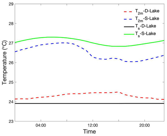 The average lake surface temperature and the 2 m air temperature on the lake over 17 lake breeze days. The solid green line and solid black line were surface temperatures for S-Lake and D-Lake, and the blue and red dotted lines were 2 m air temperatures for S-Lake and D-Lake, respectively.