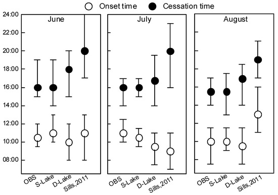 The start and end times of the S-Lake simulated lake breeze are in very good agreement with the observations (Figure 5). The lake breeze in D-Lake starts, on average, 1.5 h earlier and lasts 2 h longer than the observation. The D-Lake lake breeze starts before 9:00 on DOY160, 162, 183 and 217 and ends very late at 20:00 on DOY 170 and 182, with a lifetime as long as 10 h (DOY 162, 182 and 217).