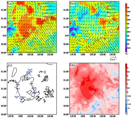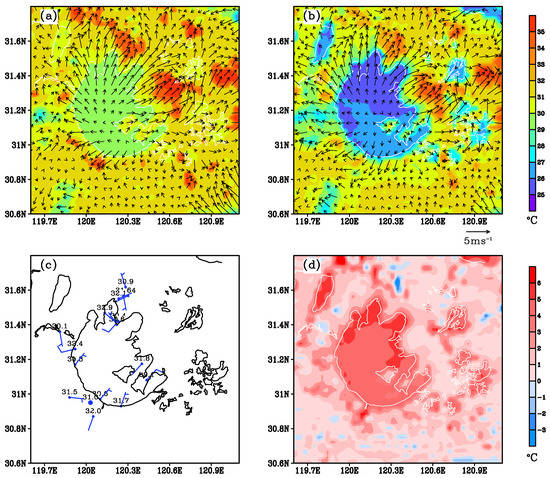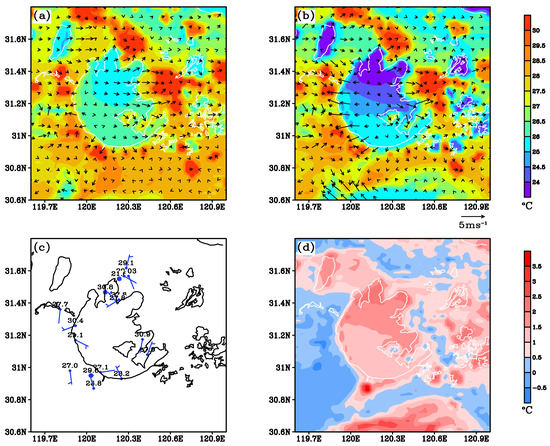 Modeled wind vector and air temperature at 2 m at 09:00 19 July 2012 (a) of S-Lake; (b) of D-Lake; (c) observed by meteorology station. (c) Observation by sites: the long pole is 4 m s−1, and the short pole is 2 m s−1; (d) difference between S-Lake and D-Lake.