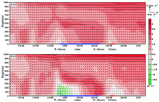 Cross section of wind vector along the center latitude (31.2° N) at 14:00 19 July 2012 by (a) S_lake; (b) D-Lake.