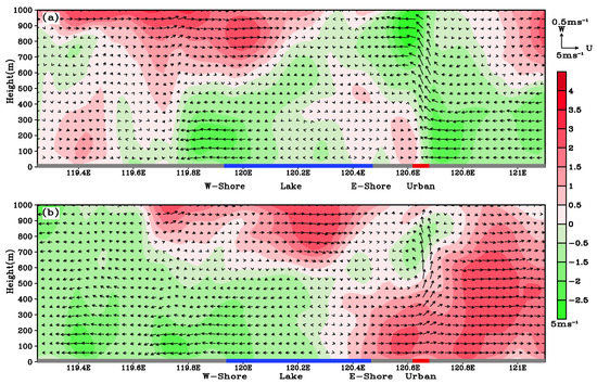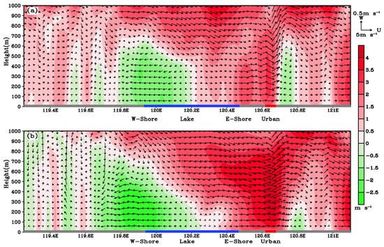 An east–west vertical cross-section of the flow reveals small land circulation cells embedded in the lake breeze (Figure 10). These cells are several km in size and extend to 1 km in height. In S-Lake, the lake breeze vertical extent is 650 m (on the west shore), and the maximum wind speed is 2 m s−1. In D-Lake, the vertical extent is 850 m, and the maximum wind is slightly higher, at 2.5 m s−1. Another difference is that in S-Lake, the lake breeze is limited to the west edge of the city of Suzhou, whereas in D-Lake, the breeze is able to penetrate the whole city.