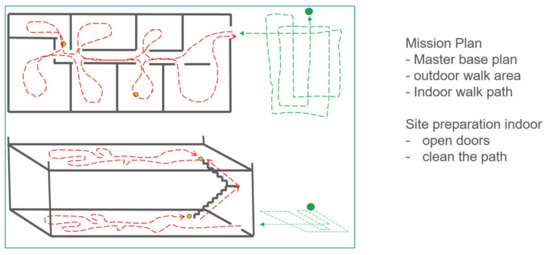 - Planning the LiDAR data acquisition mission: preparing the street lanes for the missions performed outside or the route on which it will have to be followed or, in case of inside scanning, viewing the interior and creating space for turns and walks, opening and fixing the doors. Planning for the three objectives was done using the Google Earth [25] outdoor program.