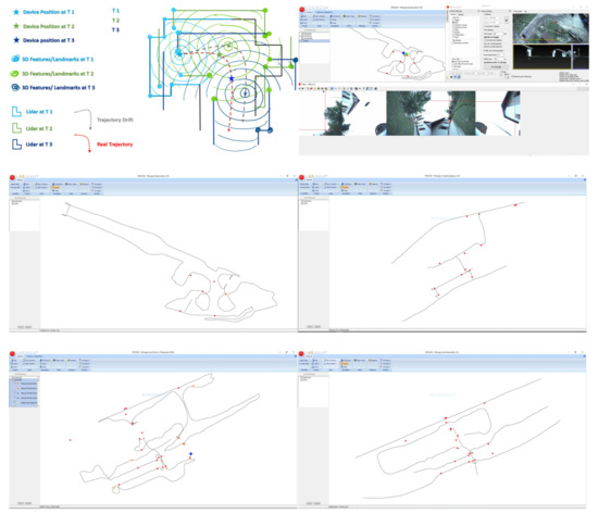 For the correct collection of Rinex data, the Master GNSS station (for all scanned objectives) was started 10 min before the initialization of the backpack (Leica Pegasus Backpack) and was turned off 10 min later after completing the collection of LiDAR data. For each of these scans, GCP checkpoints (Table 2) were determined directly in the field on the ground with the GPS equipment from Leica GS 08, and points that were used to check and realign the clouds of LiDAR points were collected with the Leica Pegasus Backpack equipment. The checkpoints were also imported into the Pegasus Manager to verify the quality of the recorded data and to verify the trajectory of the scanned objectives (Figure 7).