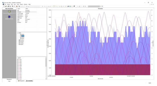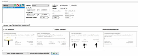 In the paper, for Rinex data recording, the static method has been used, and the data acquisition was carried out at 5 s by activation of the Long Raw Observation function. The measuring engine used is SmartTrack type which acquires satellites in seconds. The antennas used are of double frequency type: AX1202GG and ATX1230GG with SmartTrack, supporting GLONASS, GPS, and GALILEO signals. The raw data obtained was exported from the Leica 1200 GPS control using the Leica Geo Office Combined (RAW DATA) program. The reference system was WGS 84 (World Geodetic System).
