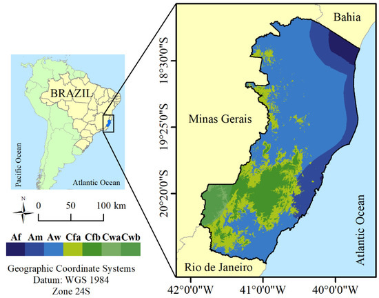 The study area comprises Espírito Santo state, Southeastern Brazil, which has a total area of 46,052.64 km2, and is located between parallels 17°53′29″ and 21°18′03″ south latitude and meridians 39°41′18″ and 41°52′45″ longitude west of Greenwich, bordering the Atlantic Ocean to the east, Bahia state to the north, Minas Gerais state to the west, and Rio de Janeiro state to the south (Figure 1).