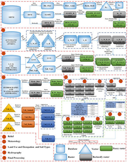 Variables were grouped into two large groups as follows: Group 1 (the basin compactness coefficient, slope, digital elevation model, annual average maximum rainfall, dry period average maximum rainfall, rainy season average maximum rainfall, annual accumulated rainfall, dry season accumulated rainfall, rainy season accumulated rainfall and proximity to hydrographies elements); Group 2 (the land use and occupation, soil classes and proximity to water masses elements). Then, we used the Analytic Hierarchy Process (AHP) that was developed by [] which proposes the solving of the problem by hierarchical levels, which generated coefficients that were used a posteriori to calculate the flood vulnerability model [].