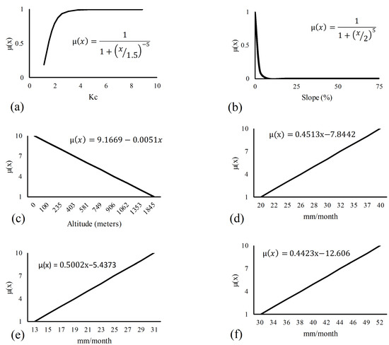 Membership functions applied to the flood vulnerability model variables. (a) Compactness coefficient; (b) slope; (c) Digital Elevation Model (DEM); (d) annual average maximum rainfall; (e) dry period average maximum rainfall; (f) rainy period average maximum rainfall.