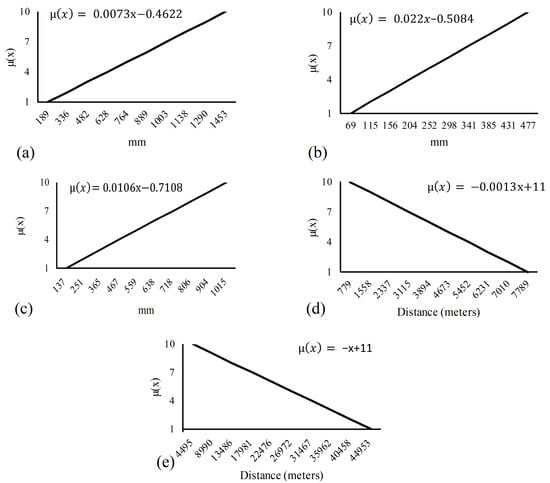 Membership functions adjusted for each studied variable of the flood vulnerability model. (a) Annual accumulated rainfall; (b) dry period accumulated rainfall; (c) rainy period accumulated rainfall; (d) proximity to hydrographies; (e) proximity to water masses.