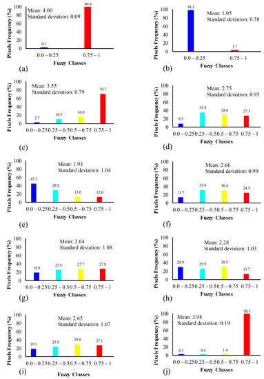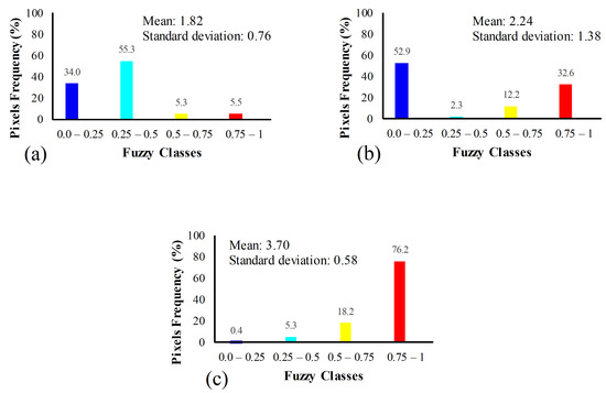 Representative histograms of pixel frequency percentage in each fuzzy class (0.0–0.25; 0.25–0.5; 0.5–0.75; 0.75–1.0) are shown in Figure 5 and Figure 6.