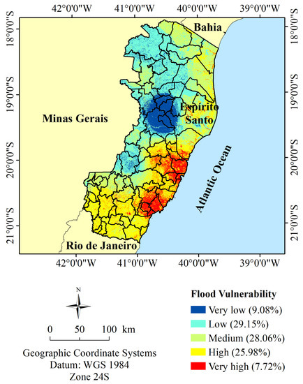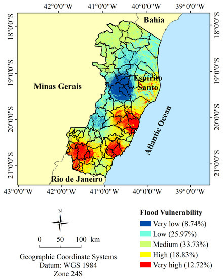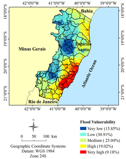 Espírito Santo state has a large area corresponding to a low flood vulnerability class, with a value of 30.91%, which is followed by medium flood vulnerability class, with a value of 25.04%. Most of these areas correspond to the state’s western region.