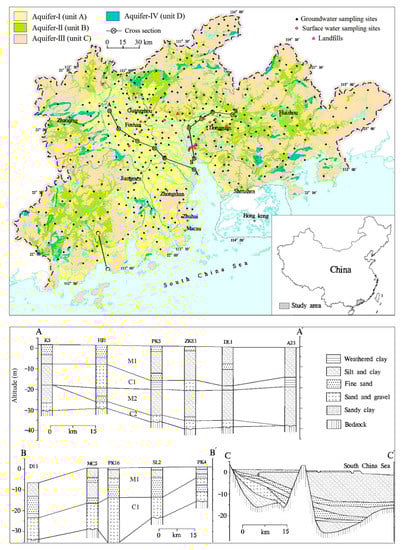 Bi et al. reported that the PRD has four types of aquifers and can be divided into four groundwater units (Figure 1) [9]. Briefly, groundwater unit A is mainly distributed in the central-southern part of the PRD and consists of coastal-alluvial plains where continental and marine formations are interbedded with each other [15]. Continental formations are dominated by sandy fluvial deposits or gravel and compose aquifer-I. The vadose zone in unit A consists of marine sediments and is predominantly silt/clay with low permeability. Groundwater unit B is outside of unit A, where valley and interhill plains are distributed, but marine formations are missing. Continental formations in this unit compose aquifer-II. Compared to groundwater unit A, vadose zone in unit B is dominated by coarser media (e.g., sandy clay) with higher permeability. Groundwater unit C is mainly distributed in hilly areas where fractured bedrocks compose aquifer-III. Groundwater unit D is related to karst aquifers (aquifer-IV) where carbonate rocks aged from the Devonian to the Permian are common. Incomplete weathering of bedrocks overlying aquifer-III and aquifer-IV result in vadose zones in groundwater units C and D being composed predominantly of coarse media (e.g., sand, gravel). In general, groundwater in the PRD is mainly recharged by precipitation and agricultural irrigation [16,17]. The direction of groundwater flow in the PRD is from groundwater units B and C to unit A [6].