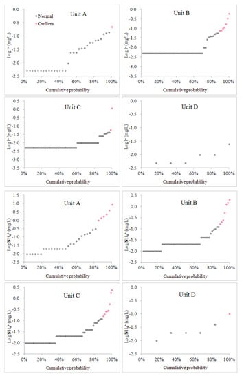 By contrast, if the used method has utility, in residual datasets, the differences between the maximum values of groundwater I− and NH4+ at different land-use types within a same unit would be insignificant in comparison with those in the original datasets because groundwaters impacted by anthropogenic inputs are excluded via the method used [8,14]. Correspondingly, in the residual datasets, the differences between maximum values of I− at various land-use types in both the A and B units were all within 0.4 times. Similarly, the differences between maximum values of NH4+ at various land-use types in both the A and B units were all within 0.8 times (except RA in unit B). These findings indicate that the differences of maximum values at various land-use types in residual datasets are more insignificant than those in the original datasets and that human activities have little impact on groundwater I− and NH4+ concentrations at different land-use types in residual datasets in comparison with those in the original datasets. Therefore, the preselection method used in this study is effective in evaluating the NBLs of groundwater I− and NH4+ in urbanized areas.