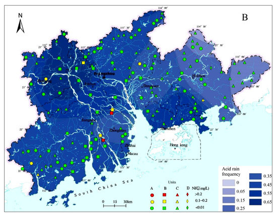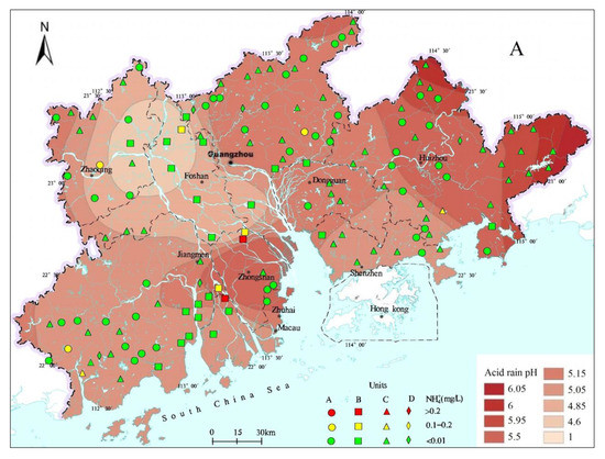 Distribution of NH4+ in various groundwater units in residual datasets and acid rain data for the Pearl River Delta (data of acid rain from Liu et al. [23]). (A) is acid rain pH, and (B) is acid rain frequency.
