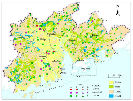NBLs as part of anthropogenic pollutants in the groundwater of the PRD have already been assessed. For example, Huang et al. used a new preselection method to evaluate NBLs of groundwater Cl− and NO3− in the PRD [8]; moreover, Bi et al. used an oxidation capacity method in combination with Grubbs’ test to assess groundwater PO43− NBL in various aquifers in the PRD [9]. By contrast, NBLs and the geogenic factors of some of their main contaminants, such as I− and NH4+ in groundwater of the PRD, have received little attention, although a few of studies have reported on the spatial distributions and origins of I−-rich and NH4+-rich groundwaters in the PRD [10,11].