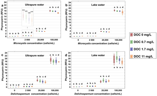 Phycocyanin readings (RFU) by using the YSI EXO2 probe of 0 (no cells added), 2000, 20,000, and 100,000 cells/mL of cyanobacterial species with spike 0, 0.7, 1.7, 11 mg/L dissolved organic carbon (DOC) of Suwannee River NOM (SRNOM): (a,b) Microcystis aeruginosa strain CPCC 300 suspended in 500 mL ultrapure water and Lake Champlain water; (c,d) Dolichospermum sp. strain CPCC 544 suspended in 500 mL ultrapure water and Lake Champlain water. The probe measured each of the sample at 250 ms interval for 10 min. The bottom and top of each box represent the 25th–75th percentiles, respectively. The whiskers represent the minimum and maximum values. The line within each box corresponds to the median value. Different letters represent significant differences between treatment comparisons (Kruskal–Wallis followed by Dunn’s post hoc test, p ≤ 0.05).