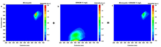 SRNOM exhibits fluorescence maximum at an excitation wavelength of 250 nm and emission wavelengths ranging from 430 to 480 nm (Figure 2b), which aligns with the wavelength reported in Yoo and Lee [67]. Cyanobacterial phycocyanin fluorescence signatures occur at high wavelength range (excitation and emission wavelength of 625 and 650 nm, respectively; Figure 2a). Comparison between the wavelengths of SRNOM and cyanobacterial phycocyanin indicates that their fluorescence is unlikely to overlap, precluding the interference from these compounds, provided quenching effects are accounted for. Similar investigations into whether the presence of NOM affects phycocyanin fluorescence readings have been undertaken by Korak et al. [37] by analyzing the EEMs. These authors found that DOM from river water (DOC of 2.65 mg/L) has no fluorescence interference with the extracted 1 mg/L phycocyanin pigment; however, with the Microcystis aeruginosa intracellular organic matter (IOM), the phycocyanin fluorescence intensity decreased by more than an order of magnitude. In addition to decreased intensity of Microcystis aeruginosa IOM, new fluorescence behavior was noted from the tests of other two species (Oscillatoria sp. and Lyngbya sp.) [37]. The authors attribute this to the quenching of cell IOM phycobiliprotein fluorescence [37]. Furthermore, Korak et al. [37] demonstrated that the decrease in phycocyanin fluorescence monitored in a DWTP could be used as a good indicator for the IOM release. However, our study found that the variation in NOM level could also cause a decline in fluorescence intensity of cyanobacterial cells (cell-bound phycocyanin). Thus, the previously found phycocyanin reduction may not be due to the release of IOM for a system that contains NOM.