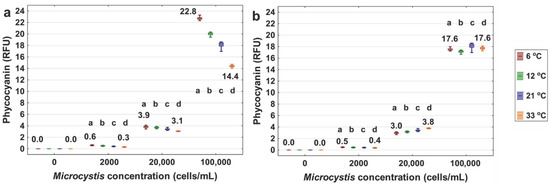 Phycocyanin readings (RFU) with the YSI EXO2 probe of the 0, 2000, 20,000 and 100,000 cells/mL of Microcystis aeruginosa strain CPCC 300 suspended in 6, 12, 21, 33 °C of ultrapure water. The probe measured each of the samples at a 250 ms interval for 10 min (a). In (b) the temperature interference was removed by adjusting the raw data to a reference temperature of 21 °C using Equation (3). The bottom and top of each box represent the 25th–75th percentiles, respectively. The whiskers represent the minimum and maximum values. The line within each box corresponds to the median value. Different letters represent significant differences between treatment comparisons (Kruskal–Wallis followed by Dunn’s post hoc test, p ≤ 0.05).