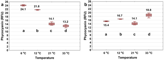 Phycocyanin readings (RFU) using the YSI EXO2 probe of 1 mg/L extract phycocyanin pigment in 6, 12, 21, 33 °C of ultrapure water. All samples were tested over the period of 10 min. The probe measured each of the sample at a 250 ms interval for 10 min (a). In (b) the temperature interference was removed by adjusting the raw data to a reference temperature of 21 °C using Equation (3). The bottom and top of each box represent the 25th–75th percentiles, respectively. The whiskers represent the minimum and maximum values. The line within each box corresponds to the median value. Different letters represent significant differences between treatment comparisons (Kruskal–Wallis followed by Dunn’s post hoc test, p ≤ 0.05).