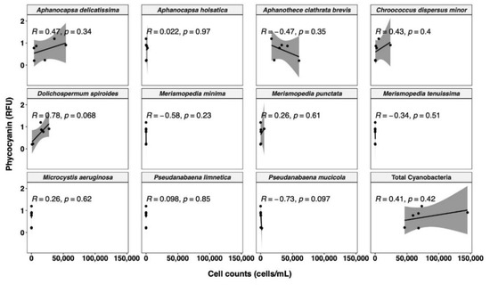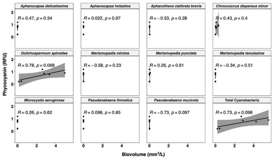 The cyanobacterial community composition has a considerable influence on the phycocyanin measurements. The R value of the best-fit line between biovolume and phycocyanin for each species ranges from −0.73 to 0.78 (Figure 5). Only with high biovolume species are high R values observed, as expected, since a low count or biovolume is not expected to correlate with a global fluorescence reading. The strongest relationship occurs in the species Dolichospermum spiroides, which accounts for 93.5% of the total cyanobacterial biovolume. Such a wide range may be due to the difference in cell size and phycocyanin cell quota between species [70,77], which can be validated by comparing the phycocyanin signal to cell counts of each species.