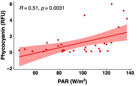 Correlations between photosynthetically available radiation (PAR) and phycocyanin probe readings for the raw water of Bedford DWTP during July and August of 2018. Shaded area around the line represents the 95% confidence interval.