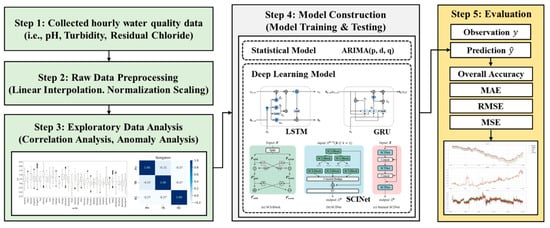 This study aims to use different deep learning models to simulate and characterize the spatial and temporal evolutions of hydrogen ion concentration (pH), turbidity, and residual chloride. This enables the interpretation of the essential variables over different seasons (time domain) and different subzones (space domain) and estimates the future change of water quality in water purification plants. To this end, five key steps are outlined in Figure 1. Figure 1 shows the acquisition, preprocessing, exploratory data analysis, model construction, and evaluation processes that make up the proposed model.