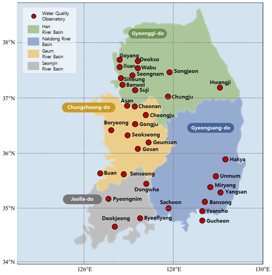 As shown in Figure 2, water management in South Korea is largely divided into four areas, and water supply facilities are operated based on the major basins in each area. The water supply facilities for the Han River basin, Geum River basin, Seomjin River and Yeongsan River basins, and Nakdong River basin are located in the Gyeonggi, Chungcheong, Jeolla, and Gyeongsang provinces, respectively [6]. On this basis, we analyzed the tap water quality characteristics of large water purification plants serving the water systems of all five major rivers in South Korea. Figure 2 shows the basins of these five major rivers and the status of major water purification plant facilities in each basin. The Han River basin, located in the central region of the Korean Peninsula, is the largest river basin in South Korea, with 11 water purification plants, including Goyang and Deokso. The Nakdong River basin is in the southeastern region of South Korea and contains eight water purification plants, including Gucheon and Miryang. The Geum River basin is in the southern midwest region of the Korean Peninsula. It is the third-largest river after the Han River and Nakdong River and has ten water purification plants, including Gosan and Gongju. The Seomjin River and Yeongsan River basins, located in the southern midwest region of the Korean Peninsula, contain four water purification plants, including Deokjeong and Donghwa.