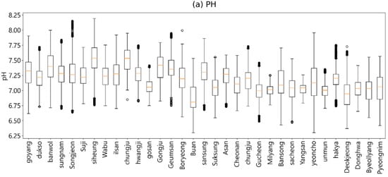 To understand the characteristics of the drinking water quality data, we analyzed water quality anomaly data that did not meet the drinking water quality standards according to water quality indicators. The average water quality values of most tap water samples were within the acceptable range of the Ministry of Environment’s drinking water guidelines. However, some water quality measurements were outside the acceptable range, with 702 tap water quality anomalies occurring over the past five years. Therefore, we analyzed the water quality anomalies for each water quality indicator. pH had the most anomalies (460), followed by turbidity (236), whereas residual chloride had far fewer anomalies (6).