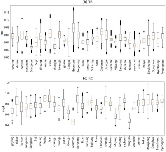 The main purpose of water quality indicator prediction is to provide accurate information for water resource management decisions and ensure in advance that drinking water quality indicators are within a reasonable range [8]. Legally recognized standards for drinking water quality in South Korea specify the acceptable values for various water quality indicators considered safe for consumption by the Ministry of Environment. First, pH indicates the acidity and basicity of water, which ranges from 0 to 14, where 7 is considered neutral. The Korean drinking water standard is a pH of 5.8–8.5, which includes alkaline and weakly acidic water; water with a pH of 7.0 is supplied to most households. Second, turbidity indicates the degree of water clarity, where lower figures indicate less indirect contamination by different pollutants or microorganisms, i.e., cleaner water. Water management in South Korea seeks to maintain turbidity at 0.5 or less, according to drinking water quality standards. Third, compared with other disinfectants, chloride is highly persistent and economical, and it is easy to examine the residual effects; therefore, residual chloride is mainly used as an indicator for tap water disinfection [3]. This is performed at the final stage of the water treatment process to prevent the growth of microorganisms and sterilize the water. The drinking water standards set the threshold of residual chloride concentration in tap water supplied to households to be 4.0 mg/L or less. Water quality is generally considered abnormal when the results exceed the standard for various pollutant and water quality indicators.