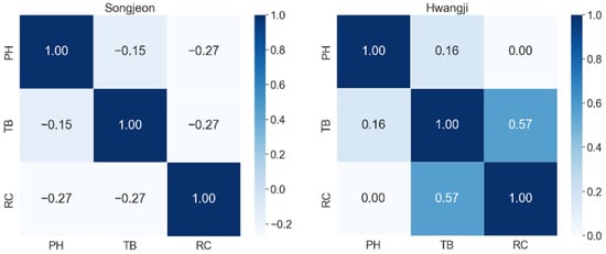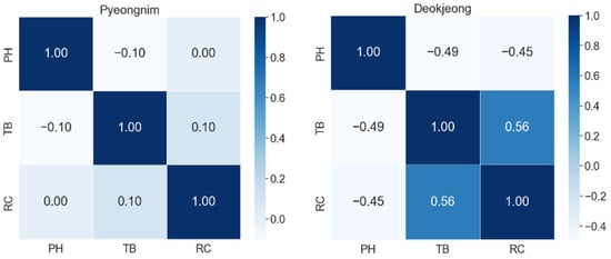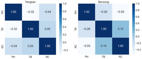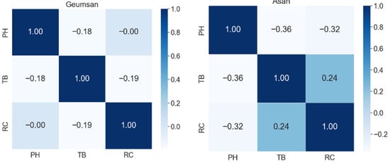 For multivariate correlation analysis of water quality information, it was essential to analyze and select correlations between various indicators [7]. In this study, we analyzed the relationships between three water quality indicators of large water purification plants in South Korea using Spearman correlation coefficients. The magnitude of the correlation coefficient indicates the degree of correlation and the sign indicates the direction of the correlation. Figure 4, Figure 5, Figure 6 and Figure 7 show the water purification plants with the highest and lowest correlations for each river basin.