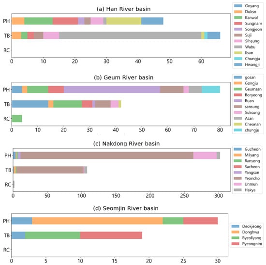 Next, we searched for anomalies in the five years of drinking water quality data for each basin (Figure 8). The Han River basin had 48 pH anomalies and 66 turbidity anomalies, 45 of which occurred at the Wabu water purification plant, where 43 exceeded the drinking water standard over three days from 14 to 16 December 2019. Outside the Wabu water purification plant, the Han River basin consistently had 15 or fewer pH and turbidity anomalies per year, indicating relatively stable water quality. No measurements exceeded the drinking water standards for residual chloride in the Han River basin. The Geum River basin had 80 pH anomalies, 42 turbidity anomalies, and 4 residual chloride anomalies; 37 of the pH anomalies occurred at the Buan water purification plant, with 25 occurring continuously over two days from 5 to 6 October 2020. The Nakdong River basin had 302 pH anomalies, 108 turbidity anomalies, and no residual chloride anomalies. The proportion of pH anomalies in the Nakdong River basin was higher than that in the other basins; of the 302 anomalies, 252 occurred in the Yeoncho water purification plant, 197 of which occurred over 12 days from 18 to 29 October 2020. Finally, the Seomjin River basin had 30 pH anomalies, 19 turbidity anomalies, and no residual chloride anomalies; 19 of the pH anomalies occurred at the Dongwha water purification plant, 16 of which occurred over a continuous period. All water quality anomalies occurred for at least two consecutive days in each basin, indicating a lack of swift responses to anomalies in tap water quality.