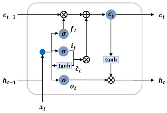 The LSTM method [9], which was proposed to solve the problems of RNNs, replaces the internal nodes with a device called a memory cell and uses a switchgear designed to accumulate information over long periods of time or forget previous information. Figure 9 shows the basic structure of the LSTM cell. The inside of each LSTM block comprises a memory cell, input gate, forget gate, and output gate, which can control information transfer in the hidden layer cell state [28]. The input gate returns information to the storage cell, the forget gate allows cell information to be forgotten or removed in the input storage cell, and the output gate outputs information from the input storage cell [29].