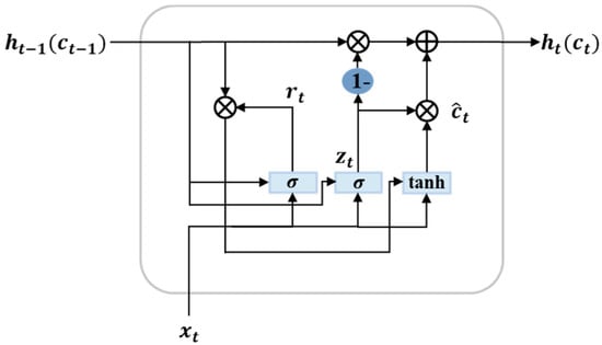 Due to its complex structure, the training process required to develop an LSTM neural network is typically very time-consuming. To speed up this process, a GRU network that is similar to the LSTM network but modified to have a simpler structure has been proposed [10]. Figure 10 shows the general structure of the GRU cell, which consists of two gates: update gate () and reset gate (). Similar to LSTM cells, the hidden state output at time t is computed using the hidden state at time t-1 and the input time series value at time t. The update gate is used to control the degree to which the previous hidden state enters the current input state. The reset gate is used to determine the amount of previous information that is discarded. is the output of the update gate at time t, is the value of the reset gate at time t, is the sigmoid activation function, and is the hidden state at . is the input vector of the current time. , , and are the corresponding weight matrix and bias vectors. The reset gate output at the current time is bit multiplied by the hidden state at the previous time . The candidate hidden state is calculated using the result of the operation and the input of the current time. A related operation is performed through the update gate to obtain the hidden state of the last moment and the current candidate hidden state . The GRU neural network is a time-recursive neural network; therefore, the gate-loop unit can hold relevant information and pass it on to the next unit that fully reflects the long-term historical course of the time series and is thus suitable for the long-term prediction of time series.