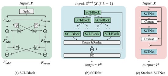 SCINet, proposed by [11], is a binary tree-based deep learning model comprising three levels: SCI-block, SCINet, and stacked SCINet, which captures time dependencies at multiple temporal resolutions to increase the predictability of the original time series. The basic block, SCI-block, decomposes the input data into even and odd sequences. It then processes using different convolution filters to extract homogeneous and heterogeneous information from each part. SCINet arranges the SCI-blocks in a binary tree structure then rearranges the child series. It concatenates all low-resolution elements into a new sequence representation, then adds them to the original time series for prediction. A stacked SCINet is composed of several SCINets with intermediate supervision. SCI-block uses different convolution kernels to extract information from two sequences. It is then used to compensate for information loss, which comprises two steps of interactive learning. The stacked SCINet architecture is shown in Figure 11a. SCINet comprises several SCI-blocks hierarchically arranged using the presented SCI-blocks to obtain the tree structure framework shown in Figure 11b. If the training sample is sufficient, then K SCINet layers can be stacked to achieve better prediction accuracy at the expense of a more complex model architecture, as shown in Figure 11c.