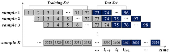 Regarding the experimental method, the first five years of data (January 2017 to December 2021) were used for the training set, and the remaining five months (1 January 2022, to 31 May 2022) were used for model validation. Time series cross-validation generally uses the rolling forecasting method to reconstruct time series data that has correlations between previous and subsequent data. Given a set of time series data, the previous time step is used as the input variable and the next time step is used as the output variable. To avoid overfitting, the rolling window method was used to cross-validate the performance of the model [32]. As shown in Figure 13, we used the fixed rolling window forecasting method, where the amount of data in each cross-validation was equally divided. This method fixed the size of the training and validation data sets in all cross-validation iterations to split the training and test data while preserving the chronologically arranged data.