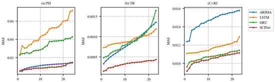 MAE values of (a) PH, (b) TB, and (c) RC, predicted with different prediction lead times and time steps.