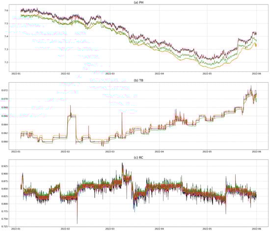 After preprocessing the water quality data according to Korean drinking water quality standards, we conducted the exploratory data analysis [27]. We performed exploratory data analysis on hourly observations of pH (PH), turbidity (TB), and residual chloride (RC) using five years of data from 2017 to 2021. First, we identified the water quality characteristics using various visualization methods based on the observational data, and then examined correlations between the water quality indicators through correlation analysis. Next, we investigated whether the tap water met the drinking water quality standards of the Ministry of Environment. Figure 3 shows the change patterns of each variable.