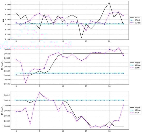 Comparison of actual and predicted water quality values for ARIMA and deep learning models over a 24-h period.