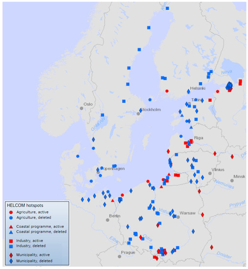 The Baltic Marine Environment Protection Commission (Helsinki Commission—HELCOM) established the point sources, so-called hot spots, around the Baltic Sea as the most polluted land sources. The first list of hot spots was established in 1992 and contained 162 locations at the time, mainly located within the Baltic Sea catchment area. Next, the purpose of HELCOM activities was to delete those hot spots and minimise their number. Now, according to the recently published hot spots list [68], only 40 hot spots are active and six of them come from agricultural areas, 14 from municipal facilities, 17 from industrial plants, and three are sensitive coastal areas, such as wetlands and lagoons. The highest numbers of the Baltic Sea hot spots are located in the southern part of the Baltic Sea Region (Figure 3).