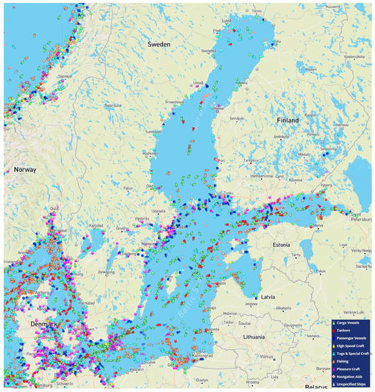 Despite the Baltic Sea’s relatively small size on a global scale (it is about 1/900 part of world marine ecosystems), 15% of worldwide shipping is concentrated within the Baltic Sea (Figure 5) [75].