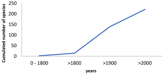 Cumulated number of alien and cryptogenic species in the Baltic Sea recorded over time (with verified records from AquaNIS 2022 [7] based on the first record of alien species).